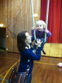 Mattias var helt ihundre på diverse hoppeputer, og var umulig å fotografere, mens Silje prøvde litt av alt. løp, hoppet, kastet baller, disset i tauene og klatret i ribbeveggene. Mest imponerte hun da hun tok fatt på landhockey, ordentlig stolt var hun og da hun traff ballen (etter litt øving).
